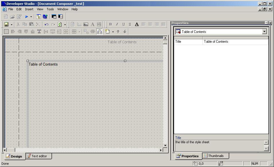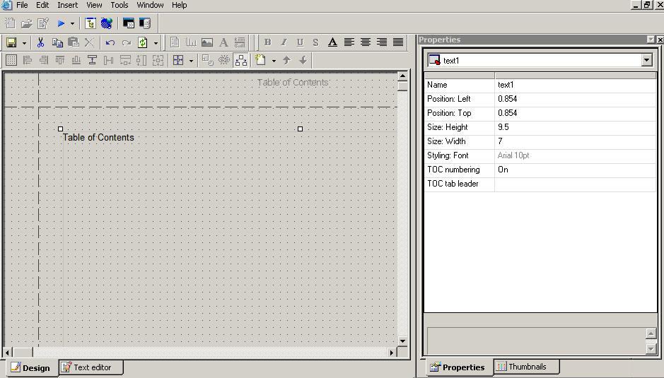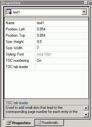 The properties for the Table of Contents text element consist of: