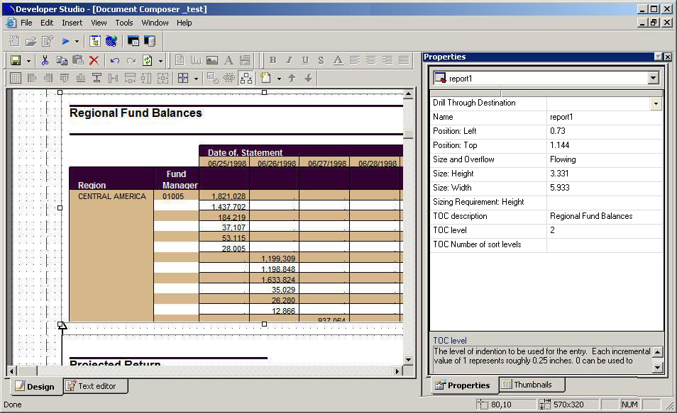 Each report, graph, and page layout object has a TOC description, TOC level option, and TOC Number of sort levels in the Properties window.