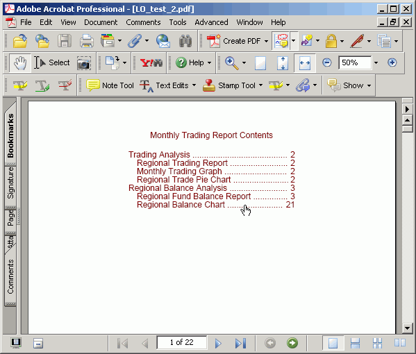 You may generate a Table of Contents (TOC) page in the Document Composer that shows a summary of the contents of the document, along with page numbers, and can be printed with the document. The entries in the Table of Contents enable you to easily navigate to a particular section while viewing the document online.
