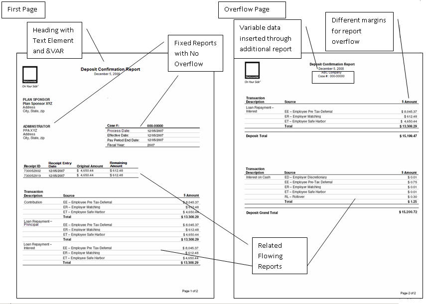 The following image is an example of a coordinated compound report with a customized overflow page. The header on the first page contains an image and a text box with an embedded variable. An additional report has been added to the header for the overflow page only.