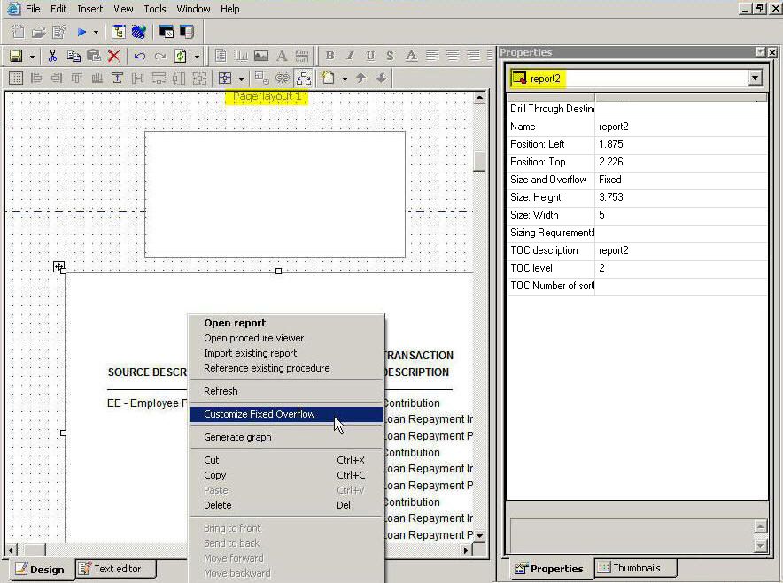 Select the report component in the page layout, right-click, and select Customize Fixed Overflow from the context menu.