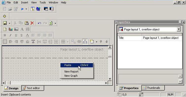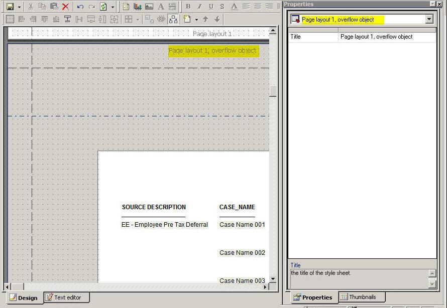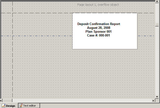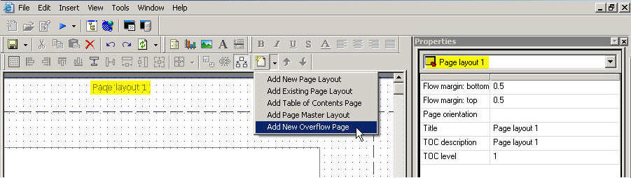 Note: If there is a flowing report component, any flow margins defined on the page layout will also appear on the overflow page. This enables you to move and resize the flow margins and add reports and graphs (as header and footer information) around the flow margins.