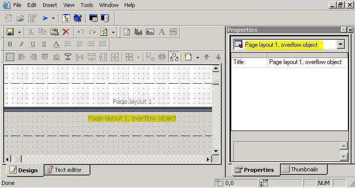 The overflow page is identified as Page layout n, overflow object, where n is the number of the corresponding page layout. The overflow page can also be accessed from the drop-down list of objects in the Properties window.