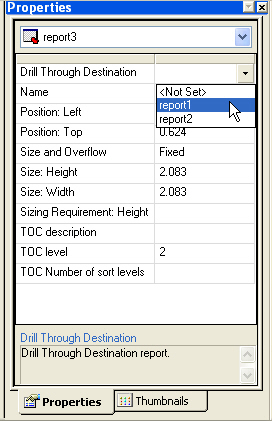 2. Select the Drill Through Destination drop-down menu. The list displays all the other report component names on the document. Note: If the report that is selected does not have DRILLTHROUGH syntax specified then the Drill Through Destination drop-down menu will be deactivated.