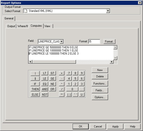 COMPUTE LINEPRICE_CLASS/I5 = IF LINEPRICE GE 50000000 THEN 0 ELSE IF LINEPRICE GE 10000000 THEN 1 ELSE IF LINEPRICE LE 1000000 THEN 2 ELSE 3