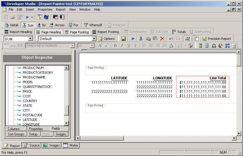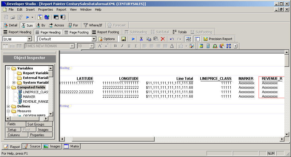 The fields are added to the Computed fields folder in the Object Inspector and are automatically added to the report as LINEPRICE_CLASS, MARKER, and REVENUE_RANGE.