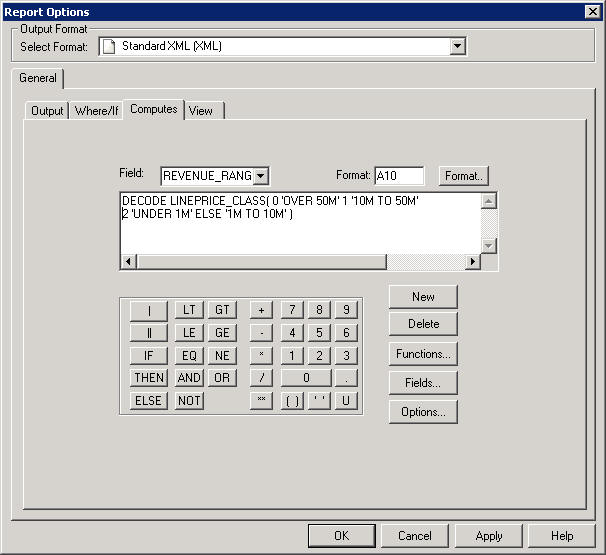 COMPUTE REVENUE_RANGE/A10 = DECODE LINEPRICE_CLASS( 0 'OVER 50M' 1 '10M to 50M' 2 'UNDER 1M' ELSE '1M TO 10M') ;