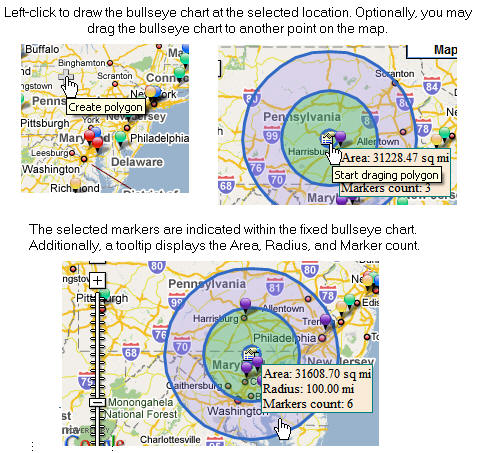 You may create a fixed or freehand bullseye chart in the Google Map output. A bullseye chart is used to show radius distance from a location using three rings of increasing size. The bullseye options are available from the New Polygon context menu on the Google Map.