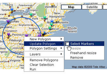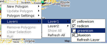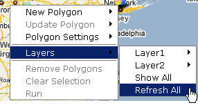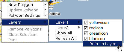 You may create a new polygon shape, change the polygon settings, show or hide markers from a layer, and refresh a layer.