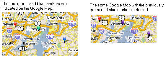 For example, the image below shows a Google Map with three markers, as indicated by a red, green, and blue marker and the same image with two of the markers selected.