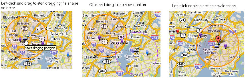 When actions are enabled from the Advanced tab of the Map Properties dialog box, you may Copy, Delete, Move, and Resize the polygon shape selectors on the Google Map.