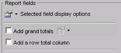 You can add grand total values to the end of your report and add a row total column by checking the appropriate boxes under Report fields as shown in the following image. The Add grand totals drop-down list provides two options. The Totals option displays grand total values for each column in your report. The Recompute Totals option recalculates computed fields before displaying the grand total values. Selecting the Add a row total column check box adds a column to display the totals for each row.