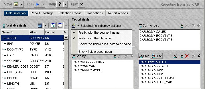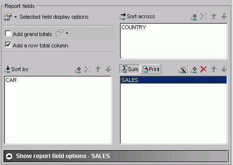 The following image shows a field selected in each of the data field boxes, the COUNTRY field in the Sort across data field box, the CAR in the Sort by data field box, and the SALES field in the Sum/Print display field list.