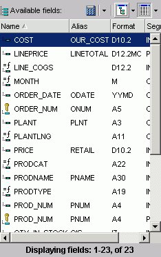 List is the default. To enable List mode, you click the List icon in the Available Fields box. You can view one or more options by clicking the Options arrow and selecting: Name, Alias, Title, Format, Description, Segment, and Filename. In List mode, you can sort any list of variables alphabetically from a to z or from z to a by clicking the attribute, for example, Name or Alias.