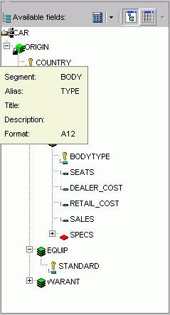 To enable Tree mode, you click the Tree icon in the Available Fields box. Click the arrow next to the Tree icon to select the Field Tree or the Dimension Tree. The following options appear in a pop-up as you mouse over each field: Segment, Name, Alias, Title, Description, and Format. You can change the field attributes that appear in the tree by selecting from the list shown when clicking on the tree icon. Select from: Name, Alias, Title or Description.