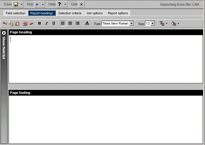 In the Report headings tab, click in the text box or press Alt+F to