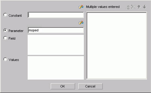 • Parameter. Enter the name of the variable. For example, moped as shown in the following image with the Parameter option button selected and the variable name entered as moped.