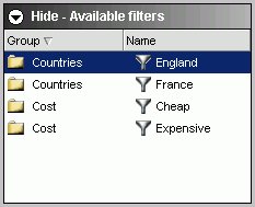 WebFOCUS displays filters in filter groups. Each filter group can contain multiple filters. Selecting a single filter within one group creates a report with simple filtering criteria. By selecting multiple filters within a group or combining filters from different groups, you can create complex filtering expressions.