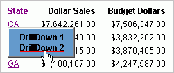 Note: You may change the default styling of the drill down menu by applying StyleSheet syntax. For more information, see Creating Multiple Drill-Down Links in the Creating Reports With WebFOCUS Language manual.
