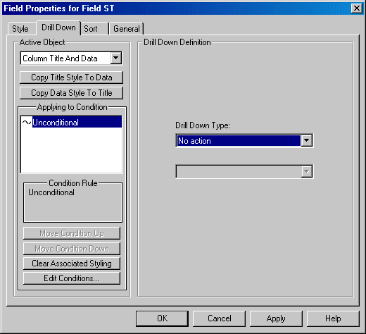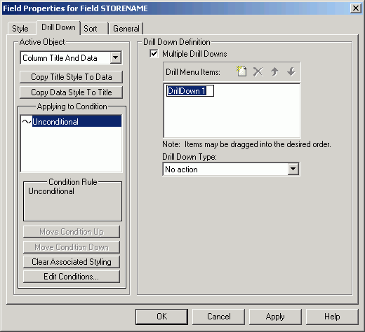 For a description of the drill down types, see Field Properties Drill Down Tab.