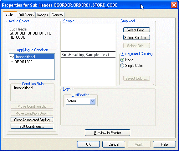Properties for Subheader (or SubFooter) dialog box. Style and Drill