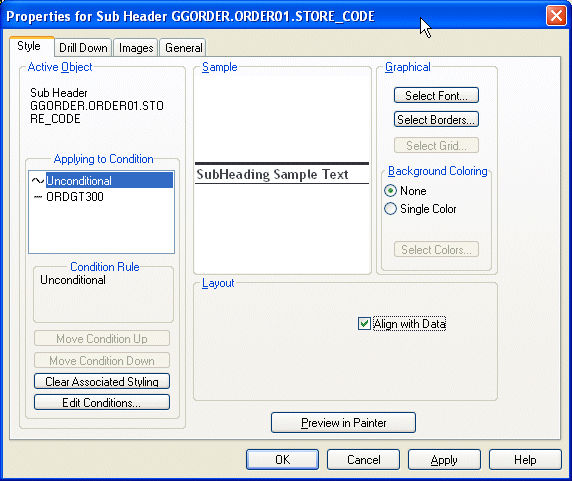The Align with Data option automatically aligns the alignment grid with the data columns in the report. This option is automatically selected for Excel 2000 and Excel 2007 output formats.