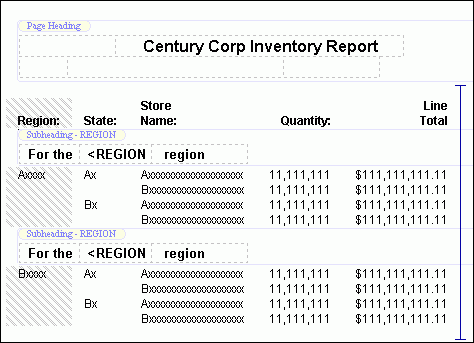 The following image shows a portion of the Report Painter with a report that has alignment grids in the Page Heading and Subheadings.
