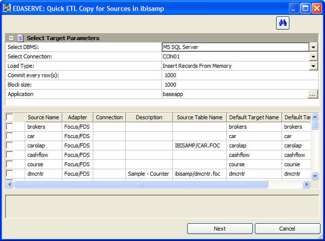 The Quick ETL Copy for Sources in dialog box opens, as shown in the following image.