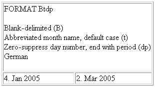 The following request prints a blank delimited date with an abbreviated month name in German. Initial zeros in the day number are suppressed, and a period is added to the end of the number: