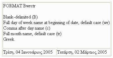 The following request prints a blank delimited date in Greek with a full day name at the beginning in the default case followed by a comma, and with a full month name in the default case: