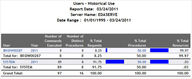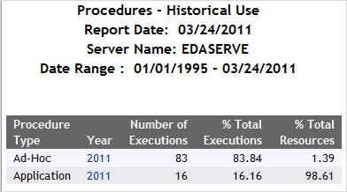 The following image shows the Procedures Report by Historical Use, which provides information on historical activity by procedures. This report summarizes by year the number of executions, users, and percentage of executions and resources used by the types of procedures at your site. Click any of the hyperlinked column headings to re-sort the report by that column.