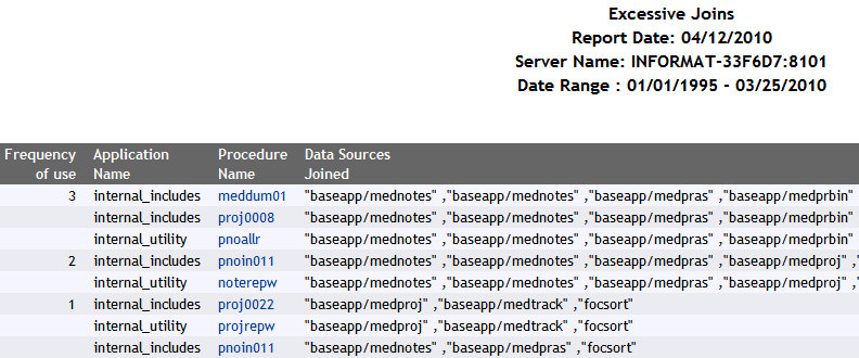 Right-click Excessive Joins and select Run from the context menu. After specifying report filters, click View Report. The report window opens. This report lists the most frequently joined data sources along with the procedures used to join them.