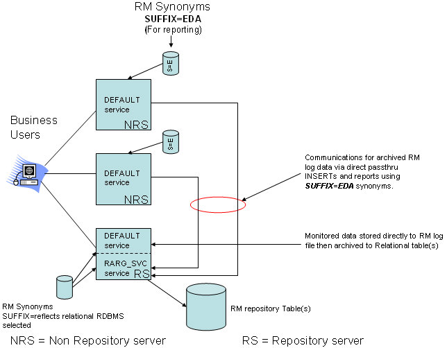 The repository server has a special service defined (RARG_SVC) that processes the monitored data insert requests from the non-repository servers. The non-repository servers have the metadata for the repository described using the syntax of SUFFIX=EDA. The access files point to the repository server so that Resource Governor reports, which are run on each non-repository server, can retrieve the stored monitored data from the repository server.