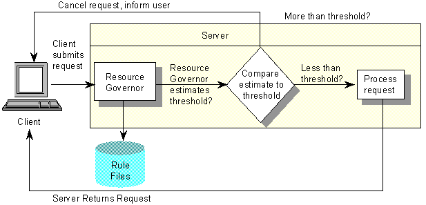 When a user submits a request against any data source monitored by Resource Governor, the governing facility performs high-speed resource usage estimates at run time, using rules that it previously determined. It uses the rules that are stored in the Rule File associated with the data source. Resource Governor decides whether to run or cancel each request based on the Rule File. Depending on the decision, one of the following actions occurs: