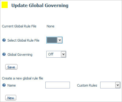 The Update Global Governing window opens, as shown in the following image. The window contains configuration options for setting Global governing on with an existing compiled business rule file or building a new rule file with existing business rules. If you have not set up business rules for global business requirements on accessing data, see Creating Business Rules.