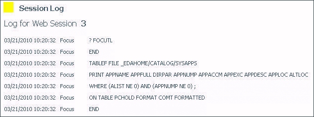 The Session Log records the activity that takes place between the current Web Console session and the server. For example, when a procedure or DataMigrator job is run, the Session Log records the WebFOCUS code and SQL statements that are sent from the console to the server for execution on the server.